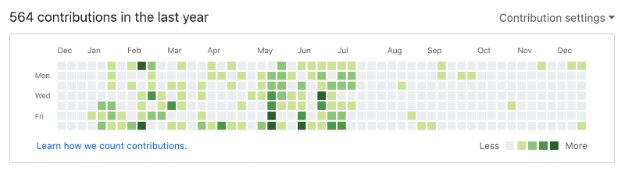 When I set up my Github repo in January 2018, I didn't know how important those little green squares would become. Every one of them represents a project I've worked on by myself or with others. I think any time version control is involved, you should get a purple square — because it's definitely harder to keep your own stuff up to date without overwriting others.